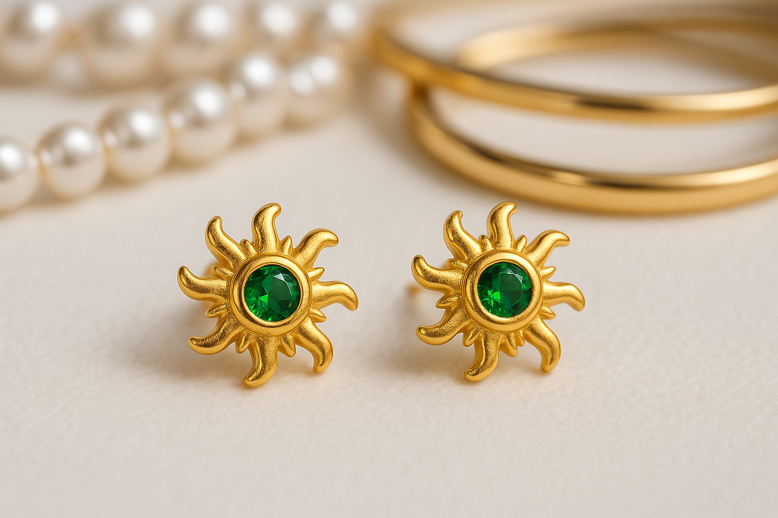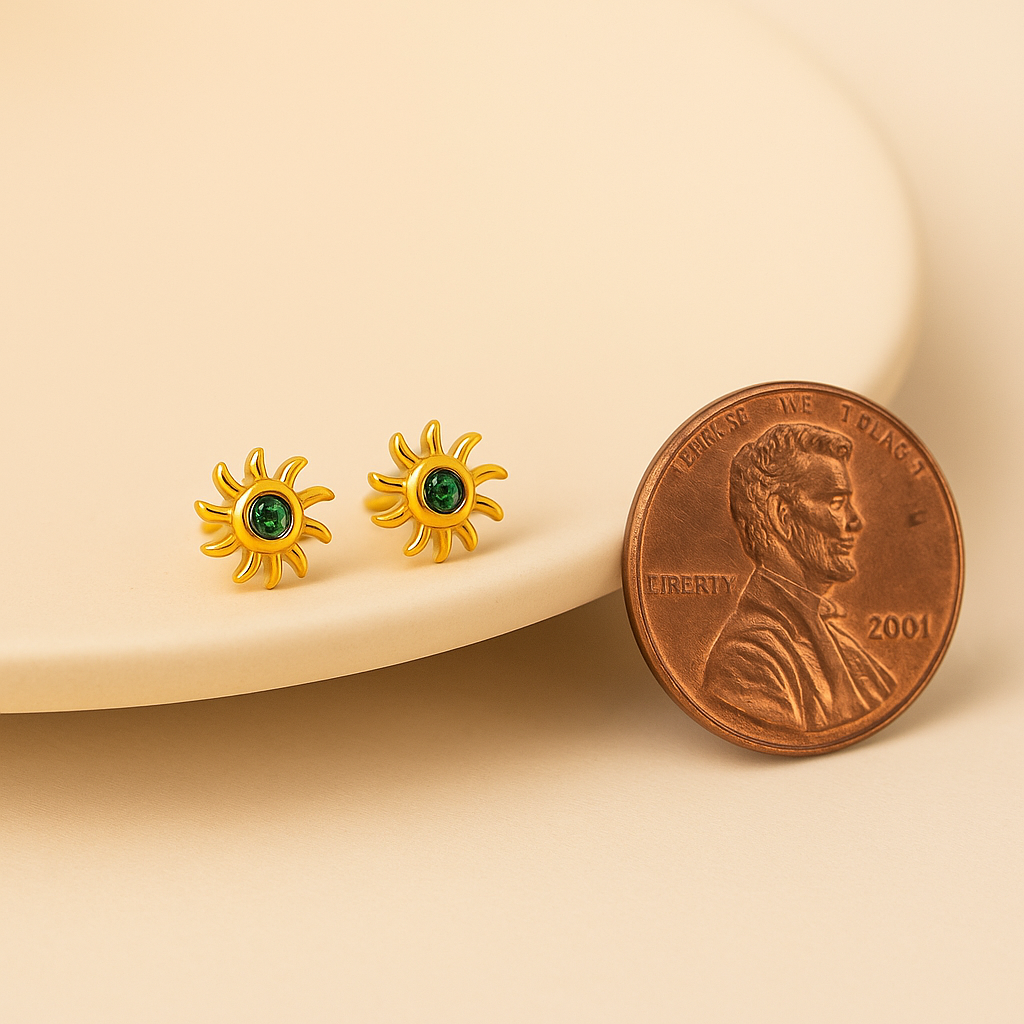 Aretes de lujo accesible Jessymell: oro 18k sobre acero quirúrgico, diseño sol con zirconia verde, hipoalergénicos y listos para regalar.